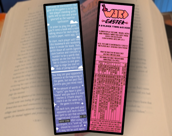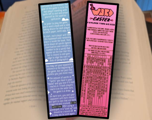 Wordcaster is a 2-player TTRPG entirely in a bookmark. It's a strategy play-the-hand-you're-dealt competitive game that typically lasts 5-10 minutes.
